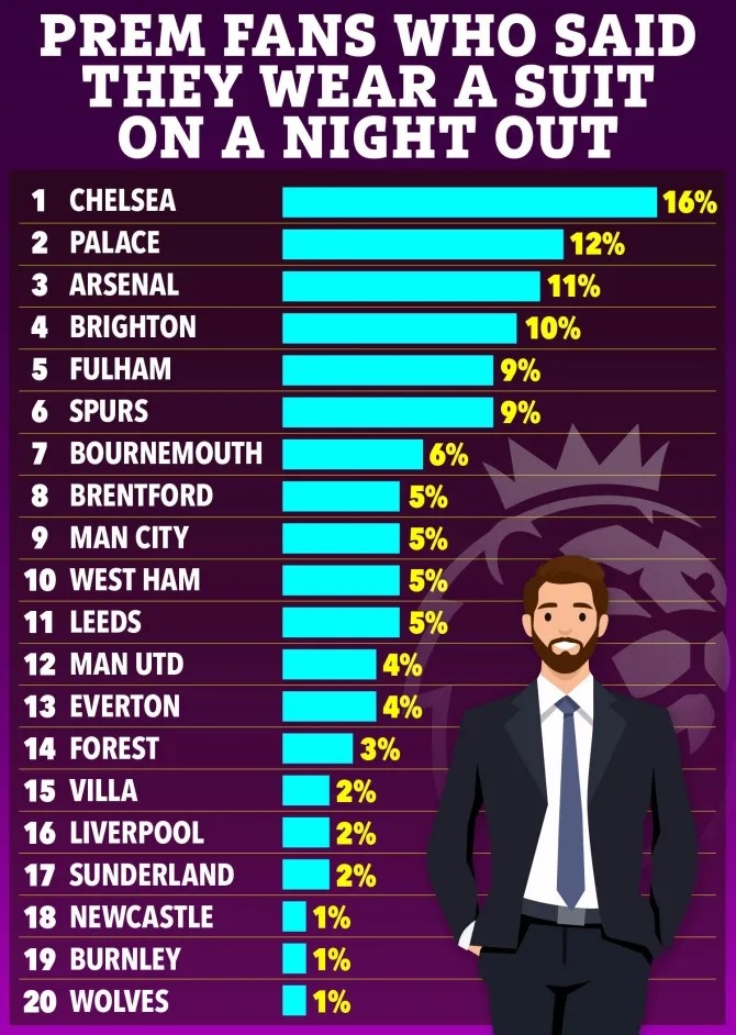 根据《太阳报》的最新调查数据显示,切尔西球迷在英超联赛中是夜晚穿西装外出的主力群体,比例高达16%。这一传统源于上世纪七十年代,切尔西的球员们引领了当时的时尚潮流,留下了深远的影响。