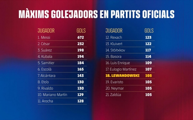 在9月29日的西甲第7轮比赛中,巴萨以2-1的比分力克皇家社会。比赛中,莱万再次展现了自己的进攻能力,打入一球,这也是他在巴萨职业生涯的第105粒进球。此数据让他追平了内马尔、埃瓦里斯托和萨尔杜阿,跻身球队历史射手榜第18位。