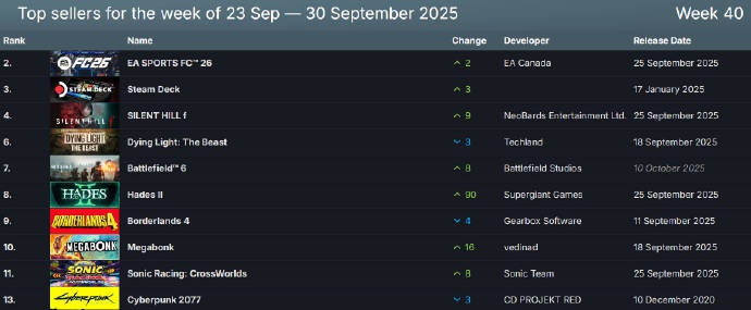 Steam销售榜单揭晓 头名为EA SPORTS FC 26 寂静岭f位列第三_体育直播