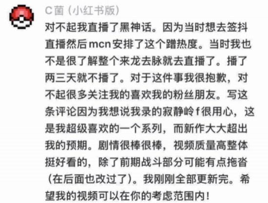 他也提到,自己在录制《寂静岭f》时面临了很大的压力,并且注重视频的数据表现。他希望能够分享高质量的内容给更多热爱《寂静岭》的玩家,但当他看到有粉丝因他的行为选择抵制新视频时,心里感到非常不舒服。他对自己的视频有信心,但也意识到自己的行为让一些人感到不快,因此写下了那条评论,却又因为言辞被误解而受到责骂。